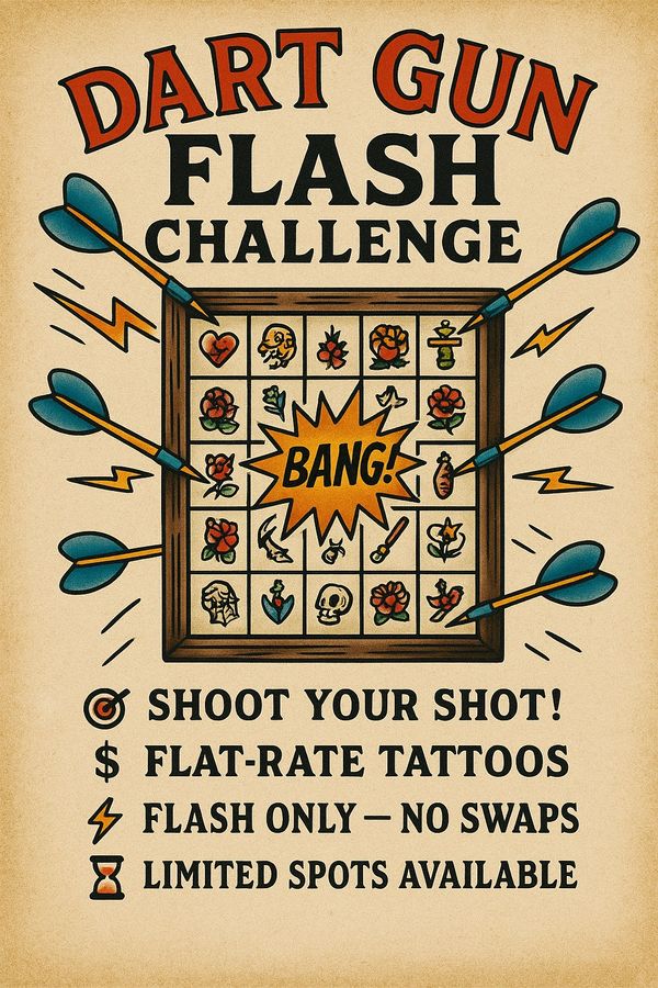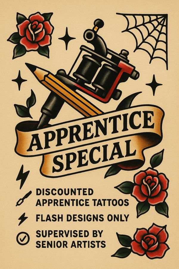 Our apprentice is offering discounted tattoos on select flash and simple custom designs — all work is supervised by a senior artist to ensure top-notch quality.